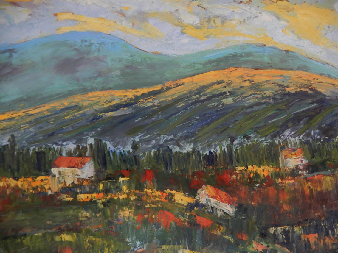 Platno napeto na leseni podokvir, slika je okvirjena (okvir in podokvir vključeni v ceno)